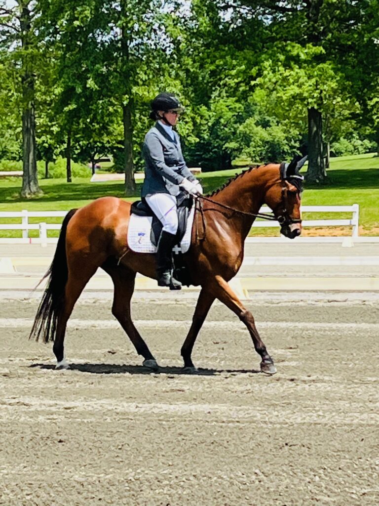 Sixbits was retrained in dressage and trail riding because of his previous rear leg injury, jumping was not recommended. He really took to dressage and loves the chance to go to shows. Sixbits is really outgoing and enjoys the interaction with the other horses at the shows.
